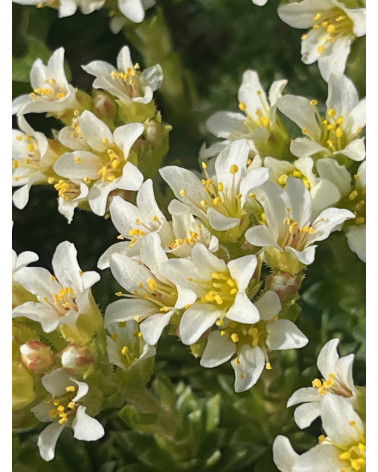 Saxifraga apiculata Alba, Weisser Kabschia-Steinbrech, Weisser Elfenbein-Steinbrech Pflanze