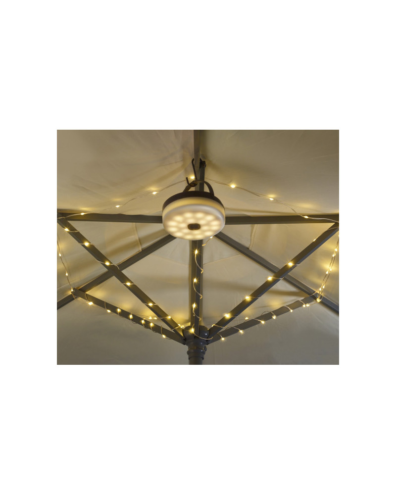 4- in- 1 Solar-LED-Kette mit 100 warmweissen LEDs. Sanftes Licht, dank Aufwickelspule. Flexibel als Laterne, Hängeampel oder Powerbank nutzbar.