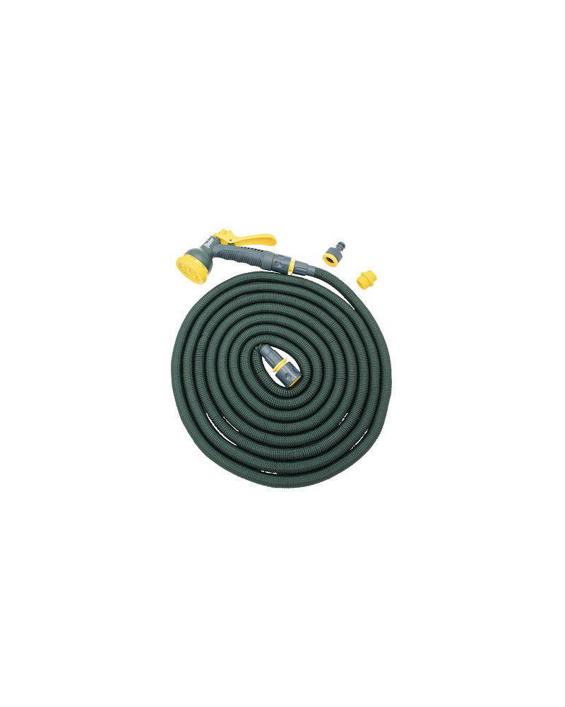 Der flexible Gartenschlauch dehnt sich unter Wasserdruck auf das Dreifache aus. Der Gartenschlauch bleibt knickfrei und zieht sich nach Gebrauch platzsparend zusammen. Optimal ab 4 Bar. Inklusive Sprühkopf mit 8 Funktionen: Start-/Stoppverriegelung, Aussen- und Innenanschluss sowie Konnektor zur Verlängerung.